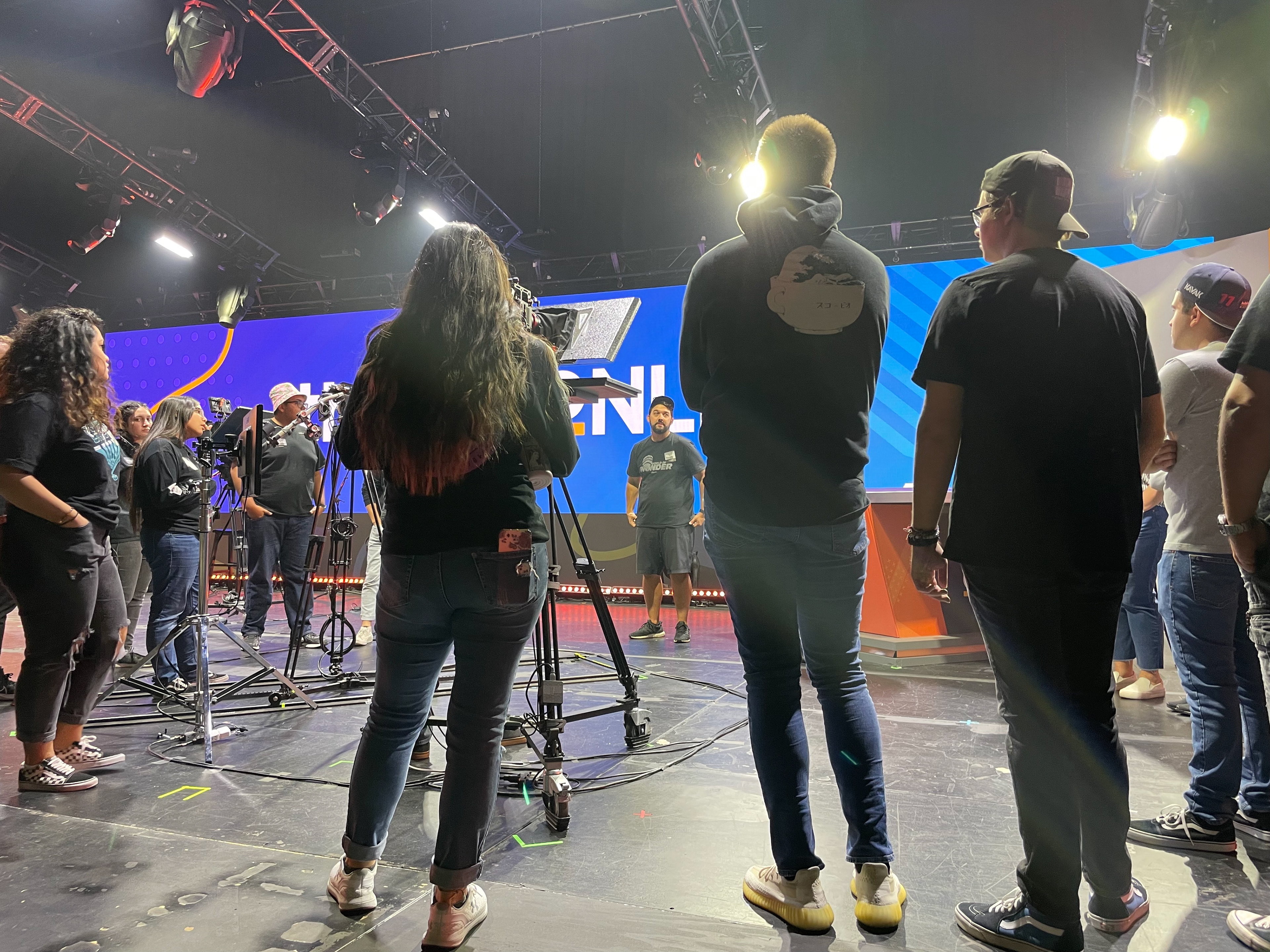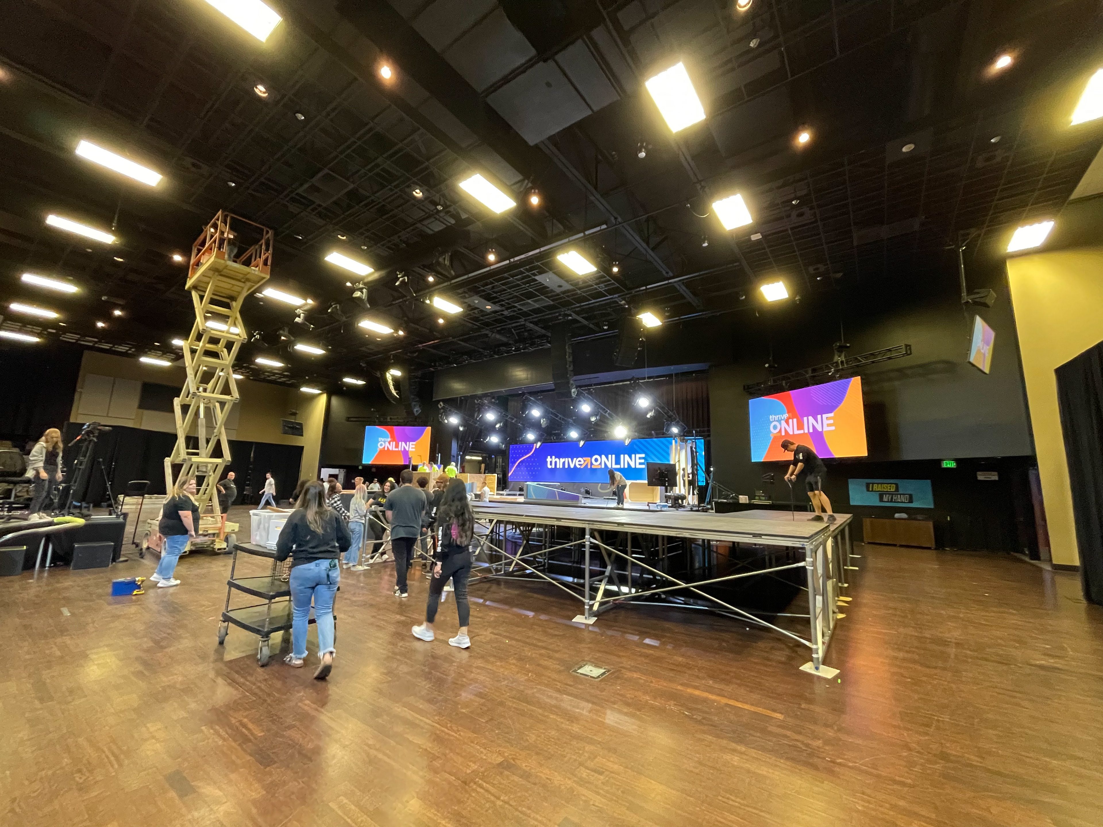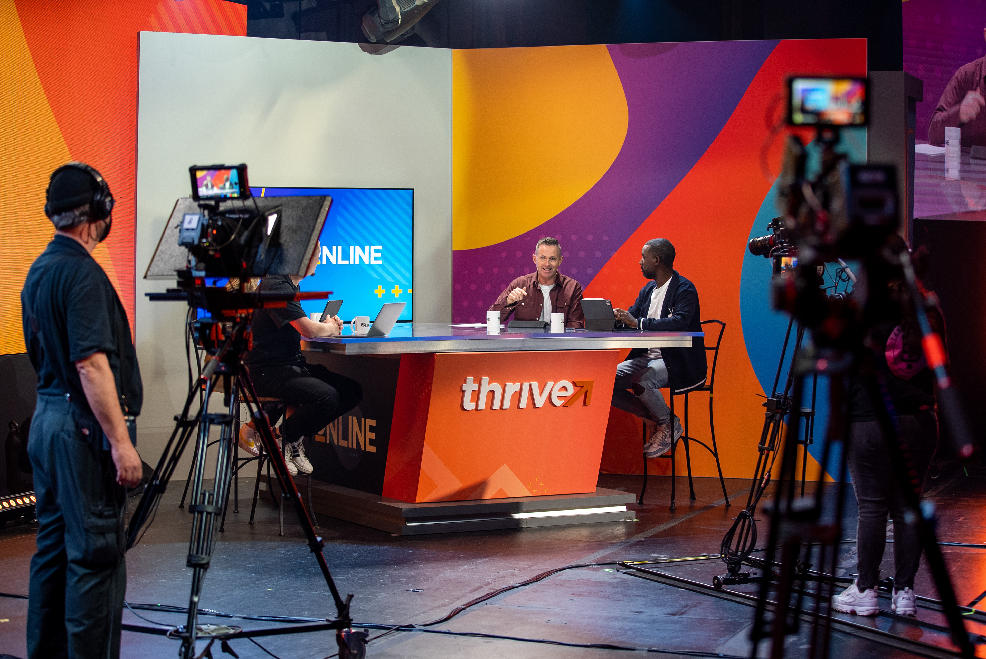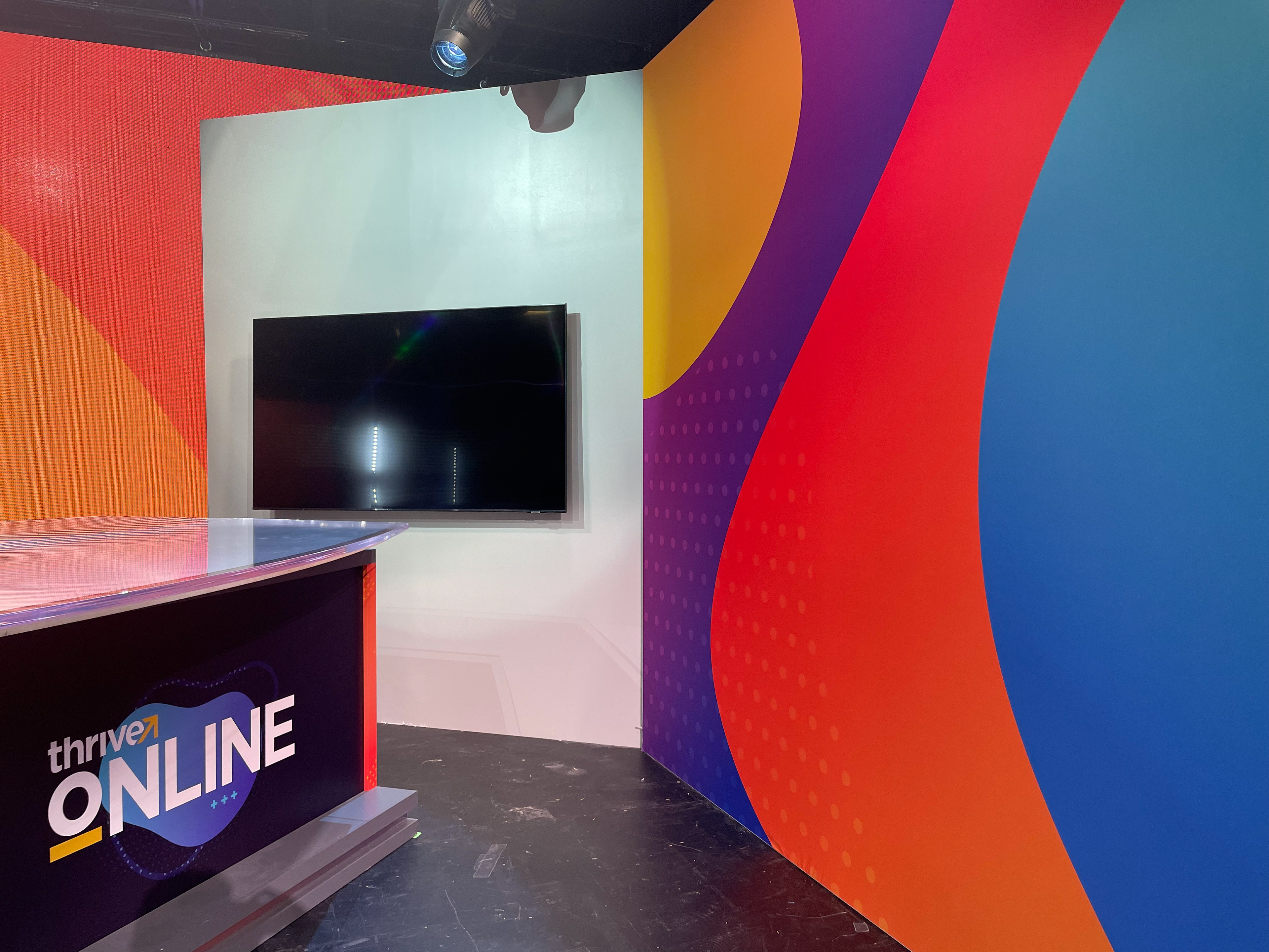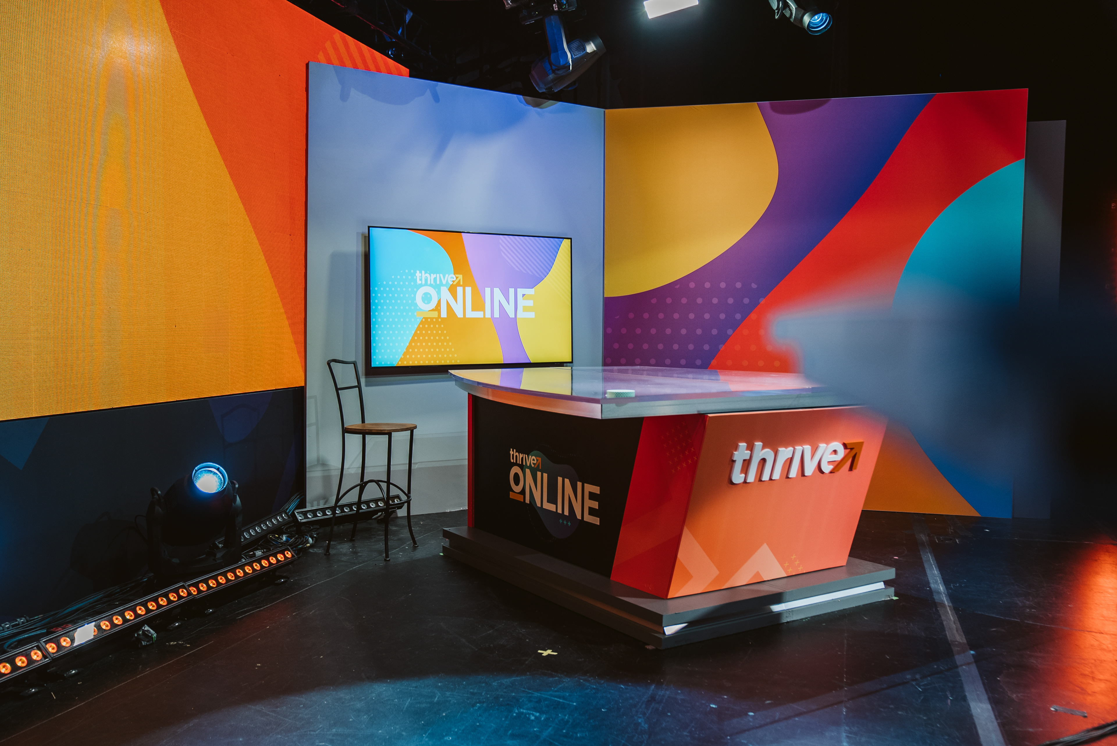Thrive Online 2021 set and environment design. Most walls and stage elements are printed fabric; others are LED screens.